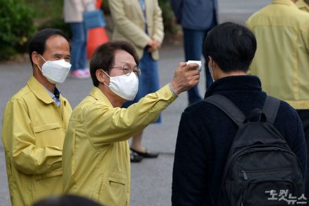 비슷한 시각 서울 종로구 경복고등학교에는 조희연 서울시교육감이 나와 학생 발열을 직접 체크하는 등 고3 등굣길을 챙겼다.