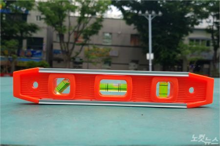 25일 자석 수평자로 문제의 다목적운동장의 수평을 재보니 좌우의 수평이 맞지 않았다(사진=김한영 기자)