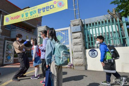 지난 27일 오전 서울 양천구 계남초등학교에서 초등학교 1~2학년 학생들이 등교하고 있다. (사진=박종민 기자/자료사진)