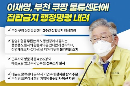 이 지사는 "물류센터는 업무 특성상 마스크 착용하기, 직원 간 거리 두기 등의 예방수칙을 준수하기 어렵다는 점을 감안하더라도 쿠팡 측의 초기 대응은 아쉬운 점이 많다"고 강조했다.