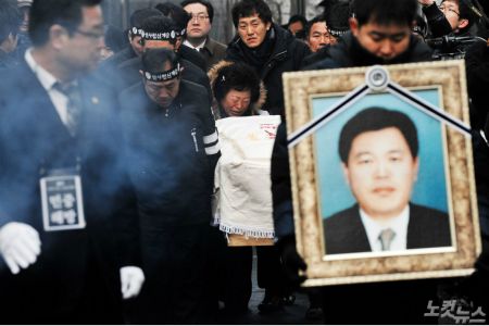 '용산참사' 철거민 희생자들의 범국민장 장례식이 거행된 2010년 1월 9일 서울 용산구 한남동 순천향대병원에서 열린 발인식에서 영정을 앞세운 시신이 운구차로 옮겨지자 유가족들이 오열하고 있다. (사진=자료사진)