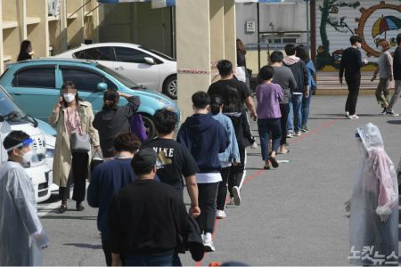 지난달 20일 오후 인천시 미추홀구청 운동장에 마련된 코로나19 선별진료소를 찾은 시민들이 줄을 서고 있다. (사진=이한형 기자/자료사진)
