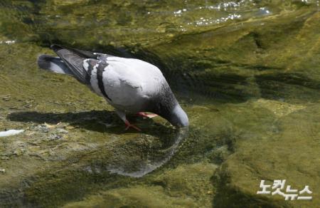 서울 최고기온 28도까지 오른 3일 오후 서울 중구 청계광장에서 비둘기가 목을 축이고 있다.