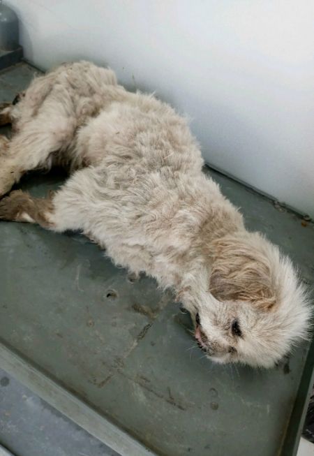 이 개는 발견 당시 얼굴과 다리가 흙에 완전히 묻힌 채 수풀에 가려져 있었다.