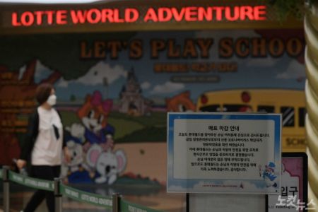 8일 오전 서울 송파구 롯데월드 어드벤처에 영업종료 안내문이 놓여져 있다. 롯데월드를 다녀간 서울 원묵고 3학년 학생이 지난 7일 코로나19 확진 판정을 받았다. 롯데월드는 현재 방역을 실시 중이며 8일까지 방역을 추가 실시한 뒤 9일 영업을 재개할 계획이다. (사진=이한형 기자)