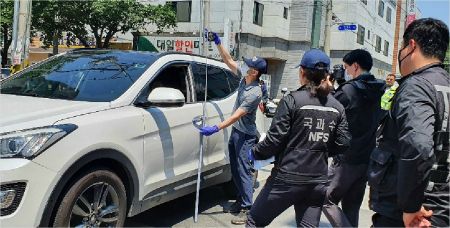 경찰과 국과수 관계자들이 현장에서 장비를 이용해 운전자의 시야 등을 확인하고 있다. (사진=독자제공)