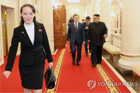지난 2018년 9월 18일 오후 평양 조선노동당 중앙위원회 본부 청사에서 김여정 노동당 선전선동부 제1부부장이 문재인 대통령과 김정은 국무위원장과 함께 정상회담장으로 이동하는 모습.