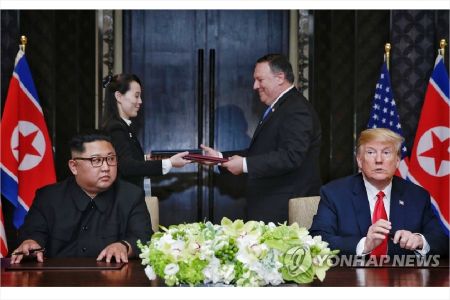 지난 2018년 6월 12일 북한 김여정 당 제1부부장과 미국 마이크 폼페이오 국무장관이 김정은 국무위원장과 도널드 트럼프 대통령이 서명한 공동합의문을 교환하고 있다. (사진=연합뉴스)