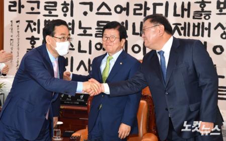 김태년 더불어민주당 원내대표와 주호영 미래통합당 원내대표가 11일 오전 서울 여의도 국회 의장실에서 원구성 협상을 위해 마련된 양당 회동에 참석해 악수하고 있다. 가운데 박병석 국회의장.