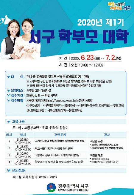 광주 서구청이 2020년 제1기 서구 학부모 대학 강좌 수강생을 모집한다.