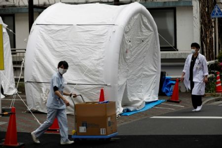 일본 도쿄의 한 종합병원에 설치된 코로나19 검사용 텐트들 옆으로 의료 관계자들이 지나가고 있다. (사진=연합뉴스/자료사진)