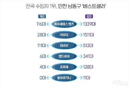 법인 차량을 포함한 전국 1위 지역은 인천 남동구다. 남동구에서 등록된 법인수입차는 5947대로 강남구 전체 등록 수입 차량의 2배를 넘는다.