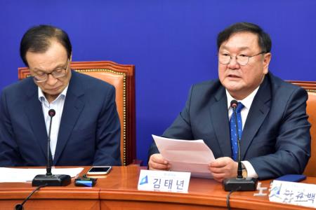 18일 오후 국회에서 열린 더불어민주당 외교안보통일자문회의에서 김태년 원내대표가 발언을 하고 있다.