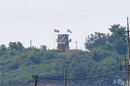 개성 남북공동연락사무소를 폭파했던 북한이 오늘 금강산 관광지구와 개성공단 지역에 군부대를 전개할 것이라고 밝힌 17일 경기도 파주 접경지역에서 바라본 북한 초소에 인공기와 최고사령관기가 다시 게양돼 있다. (사진=박종민 기자/자료사진)