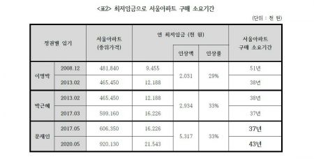 경실련은 "문재인 정부는 연(年) 최저임금을 530만원으로 역대 정부 중 가장 많이 올렸다"며 "그런데 최저임금으로 서울 아파트를 장만하는 데 걸리는 기간은 43년으로 (임기 초에 비해) 6년 이상 늘었다"고 밝혔다.