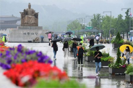 본격적인 장마가 시작된 24일 서울 광화문광장에서 시민들이 우산을 쓴 채 발걸음을 재촉하고 있다. 황진환기자