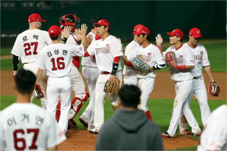 8연패 탈출 후 기뻐하는 SK 선수들 (사진=연합뉴스)