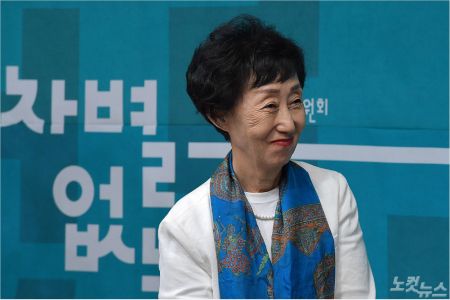 국가인권위원회 최영애 위원장이 30일 오전 서울 중구 국가인권위원회에서 '평등 및 차별금지에 관한 법률' 제정을 위한 의견표명 관련 기자회견 전 미소짓고 있다. (사진=박종민 기자)