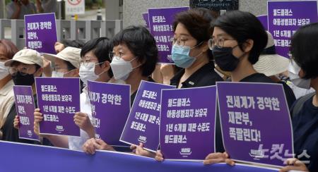 여성의당이 7일 서울고등법원 동문 앞에서 손정우 미국 송환 거부 서울고법 형사 20부 재판부 규탄 기자회견을 하고 있다.