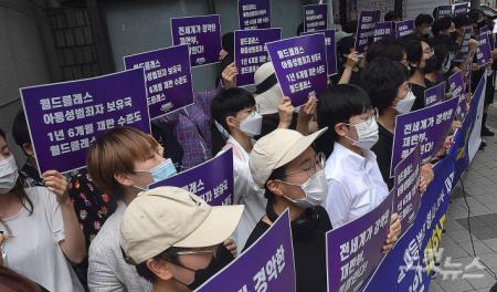 여성의당이 7일 서울고등법원 동문 앞에서 손정우 미국 송환 거부 서울고법 형사 20부 재판부 규탄 기자회견을 하고 있다.