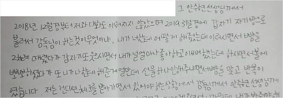 더불어민주당 임오경 의원이 추가 피해자들과 대화하며 경주시청 트라이애슬론(철인 3종)팀 내 '팀 닥터'라고 불린 안주현 씨의 폭행 및 추행 정황을 발견했다고 7일 밝혔다. 사진은 추가로 제기된 '팀 닥터'의 추행 정황 진술.(서울=연합뉴스)