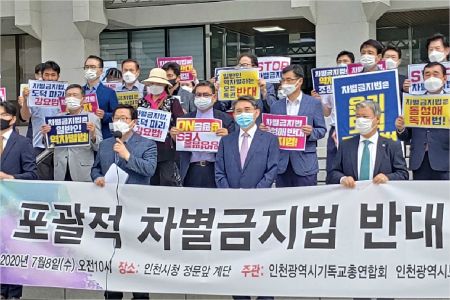 인천기독교총연합회(인기총, 회장 김태일 목사)는 8일 인천시청 앞에서 포괄적 차별금지법을 반대하는 기자회견을 열었다.