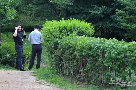 박원순 서울시장이 실종됐다는 신고가 접수된 9일 서울 종로구 와룡공원 인근에서 경찰이 무전을 하고 있다.