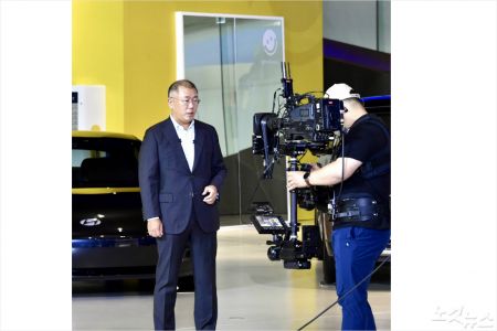 정 부회장은 이날 일산의 자사 스튜디오에서 중계된 화상 보고에서 "지금 보시는 3차종이 저희가 앞으로 선보일 미래 전기차"라며 '전기차‧수소전기차 비전'과 관련해 운을 뗐다. 그가 소개한 차량은 각각 제네시스 에센시아, 기아 퓨처론, 현대 프로페시 등 현대차그룹이 발표한 순수전기차(EV) 콘셉트카들이다.