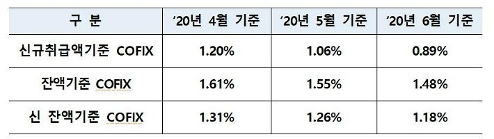 전달 코픽스와 연계해 다음달 다루는 주택담보대출 금리를 산정하는 은행들은 사상 최저 수준의 금리를 적용하고 있다는 설명이다. 전날 은행연합회는 6월 신규취급액 기준 코픽스가 0.89%로 5월(1.06%)보다 0.17%포인트 떨어졌다고 발표했다. 코픽스가 1%를 밑돈 것은 2010년 2월 공시를 시작한 이후 처음이다.
