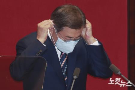 문재인 대통령이 16일 오후 서울 여의도 국회에서 열린 제21대 개원식에서 연설을 마치고 마스크를 착용하고 있다.
