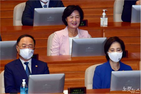 추미애 법무부 장관이 21일 국회 본회의에 참석하며 밝은 표정을 짓고 있다. (사진=윤창원 기자)