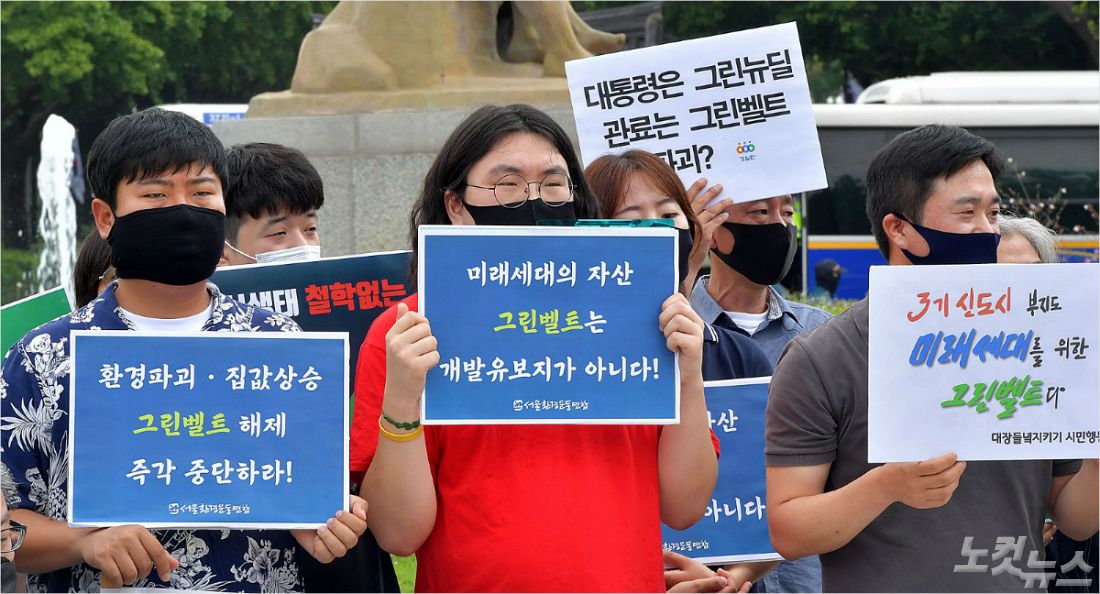 환경운동연합 등 시민사회단체 회원들이 21일 서울 청와대 분수대 앞에서 그린벨트 보전 발표에 대한 입장을 밝히고 있다. (사진=박종민기자)