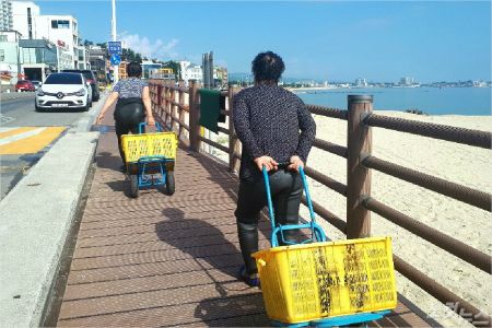 탈의실이 없어 제대로 환복도 하지 못한 채 장비를 수레에 싣고 집으로 이동하고 있는 해녀들(사진=유선희 기자)