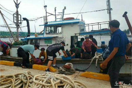 고성 대진지역 해녀들이 물질을 하고 들어온 모습. 탈의실이 없어 일부 해녀는 배안에서 환복하기도 하고, 일부는 그냥 잠수복을 입은채 들어오기도 한다.(사진=유선희 기자)