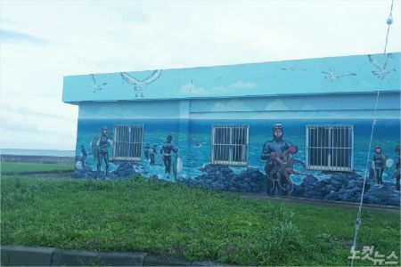 제주도 제주시 구좌읍 평대리의 한 어촌계 건물로, 해녀 벽화가 그려져 있어 눈길을 끌고 있다.(사진=유선희 기자)