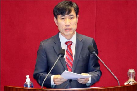 미래통합당 하태경 의원이 24일 국회 본회의에서 교육·사회·문화 분야에 관해 대정부 질문을 하고 있다.(사진=연합뉴스)