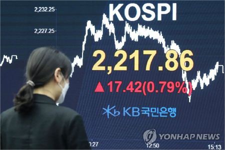 27일 코스피가 이날 코스피는 전 거래일보다 17.42포인트(0.79%) 오른 2,217.86에 거래를 마쳤다. 코스닥 지수는 전 거래일보다 6.43포인트(0.81%) 오른 801.23에 종료했다. 사진은 이날 서울 여의도 KB국민은행 딜링룸. (사진=연합뉴스)