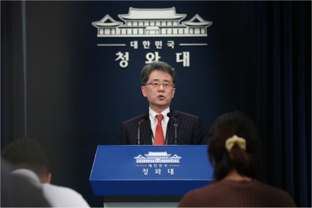 김현종 청와대 국가안보실 2차장이 28일 청와대에서 한미 미사일지침 개정에 따른 우주발사체 고체연료 사용제한 해제와 관련해 브리핑하고 있다.(사진=연합뉴스)