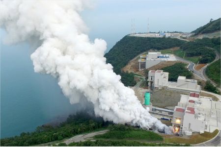 전라남도 고흥 나로우주센터에서 75t 액체 로켓엔진 연소시험을 하는 모습.(사진=연합뉴스)