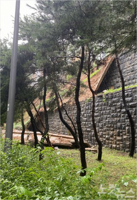 29일 광주지역에 쏟아진 집중호우로 인해 광주시 남구 효천중학교의 담당 축대 일부가 무너졌다.(사진= 광주 남구청 제공)