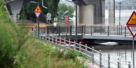 밤새 내린 폭우로 3일 오전 중랑천 수위가 상승한 가운데 한 시민이 통제된 살곶이 다리를 건너고 있다.