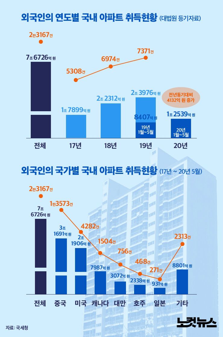 3일 국세청은 외국인의 아파트 취득건수를 발표했다. 2017년 5308건에서 2018년 6974건, 2019년 7371건으로 나타났다. 특히 올해는 5월말까지 3514건에 이르는 것으로 조사됐다.