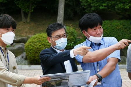 태산패밀리파크 공사 현장에 대한 점검에 나서 개선사항을 살피고 있는 모습이다.(사진=김포시청 제공)