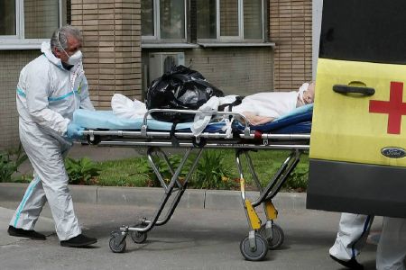 코로나19 환자를 운송하는 러시아 의료진(사진=연합뉴스)