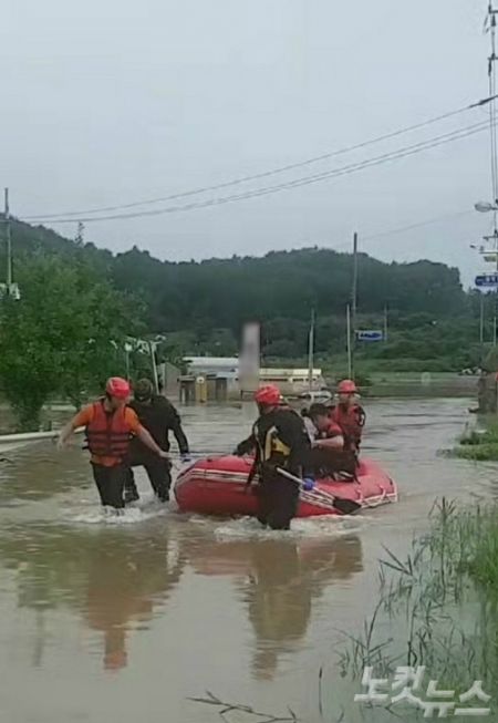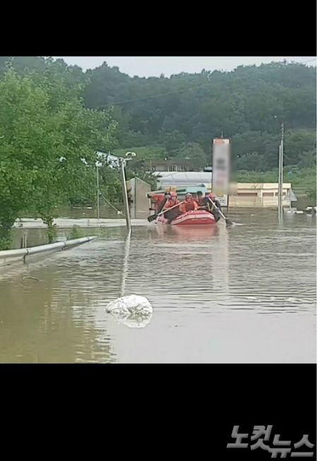 강원도 철원군 한탄천이 범람해 마을이 침수되자 소방당국이 고무보트를 이용해 고립 주민을 구조하고 있다.(사진=독자 제공)