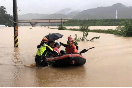 8일 오전 광주 광산구 산막동에서 119 구조대원들이 보트를 이용해 이재민을 구조하고 있다. 광주전남지역은 이틀간 내린 폭우로 도로가 잠기고 산사태가 발생하는 등 피해가 잇따르고 있다. (사진=광주시소방본부 제공)