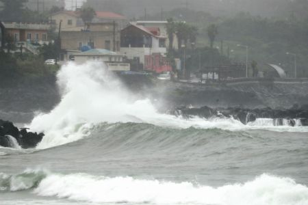 제5호 태풍 '장미'가 제주도에 근접한 10일 오전 제주 서귀포시 표선읍 토산2리 해안가에 강한 파도가 몰아치고 있다.(사진=연합뉴스)