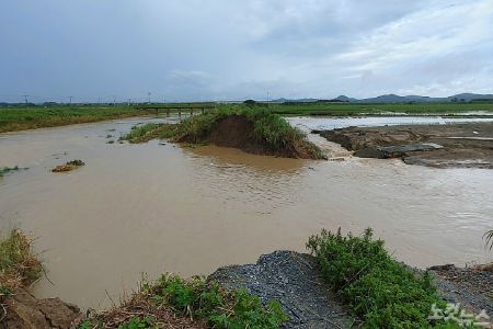 지난 7일부터 내린 기록적인 폭우로 영산강 지류인 문평천 제방이 무너졌다.(사진=박요진 기자)