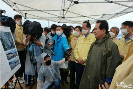 10일 남원 섬진강 제방 붕괴현장을 찾은 정세균 국무총리(사진=송승민 기자)