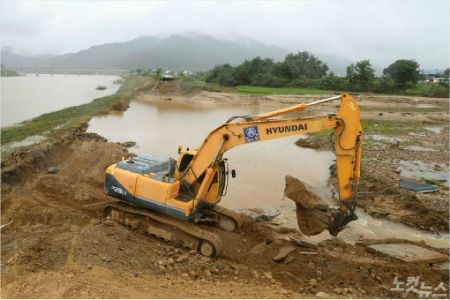 10일 남원 섬진강 제방 붕괴 현장에서 응급복구가 이뤄지고 있다.(사진=남승현 기자)